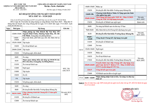 Hãy cùng chờ đón sự tỏa sáng của Top 30 tại đêm Chung kết toàn quốc Giọng ca vàng Bolero Việt Nam mùa XI vào ngày 15/11/2025. Chương trình được Livestream trực tiếp trên các hạ tầng mạng xã hội của BTC cuộc thi. Đặc biệt, đêm truyền hình trực tiếp Chung kết xếp hạng trao giải được phát sóng trên kênh VTV9, VTVgo ngày 16/11/2025.