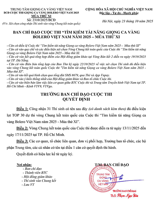 Sau nhiều ngày hồi hộp chờ đợi, hôm nay – 23/10/2025, Ban Tổ chức cuộc thi Giọng ca Vàng Bolero Việt Nam mùa XI đã chính thức công bố Top 30 thí sinh xuất sắc nhất bước tiếp vào vòng Chung kết toàn quốc.