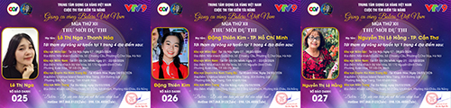 Mang SBD 025 là thí sinh Lê Thị Nga tới từ Thanh Hóa. Chúc mừng thí sinh Đặng Thiên Kim tới từ TP. Hồ Chí Minh có SBD 026. Tới từ TP. Cần Thơ là Nguyễn Thị Lệ Hằng với SBD 027.