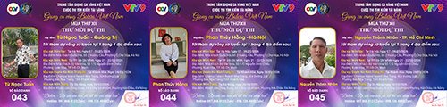 Chúc mừng Từ Ngọc Tuấn tới từ Quảng Trị có SBD 043. Tiếp theo là Phan Thúy Hằng mang SBD 044 đến từ Hà Nội. Và Nguyễn Thành Nhân mang SBD 045 đến từ TP. Hồ Chí Minh.