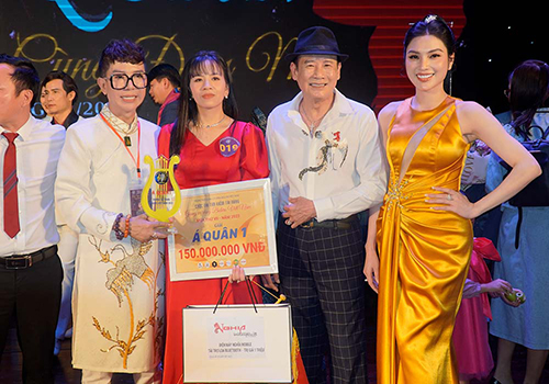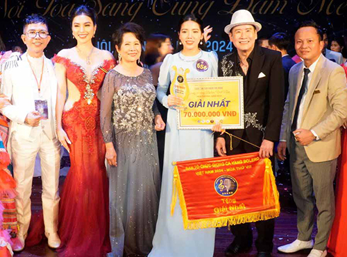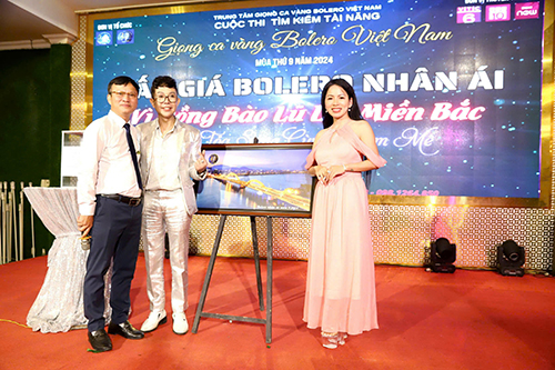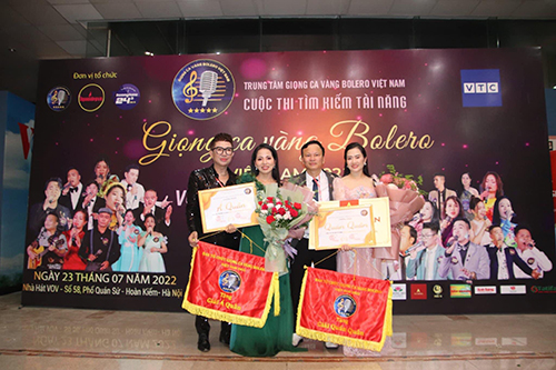 Quán quân Giọng ca vàng Bolero Việt Nam 2022 Bùi Thúy Nga và Trưởng Ban chỉ đạo cuộc thi - ông Phạm Ngọc Đóa - Trưởng Ban tổ chức cuộc thi - Bà Kim Huyền Sâm