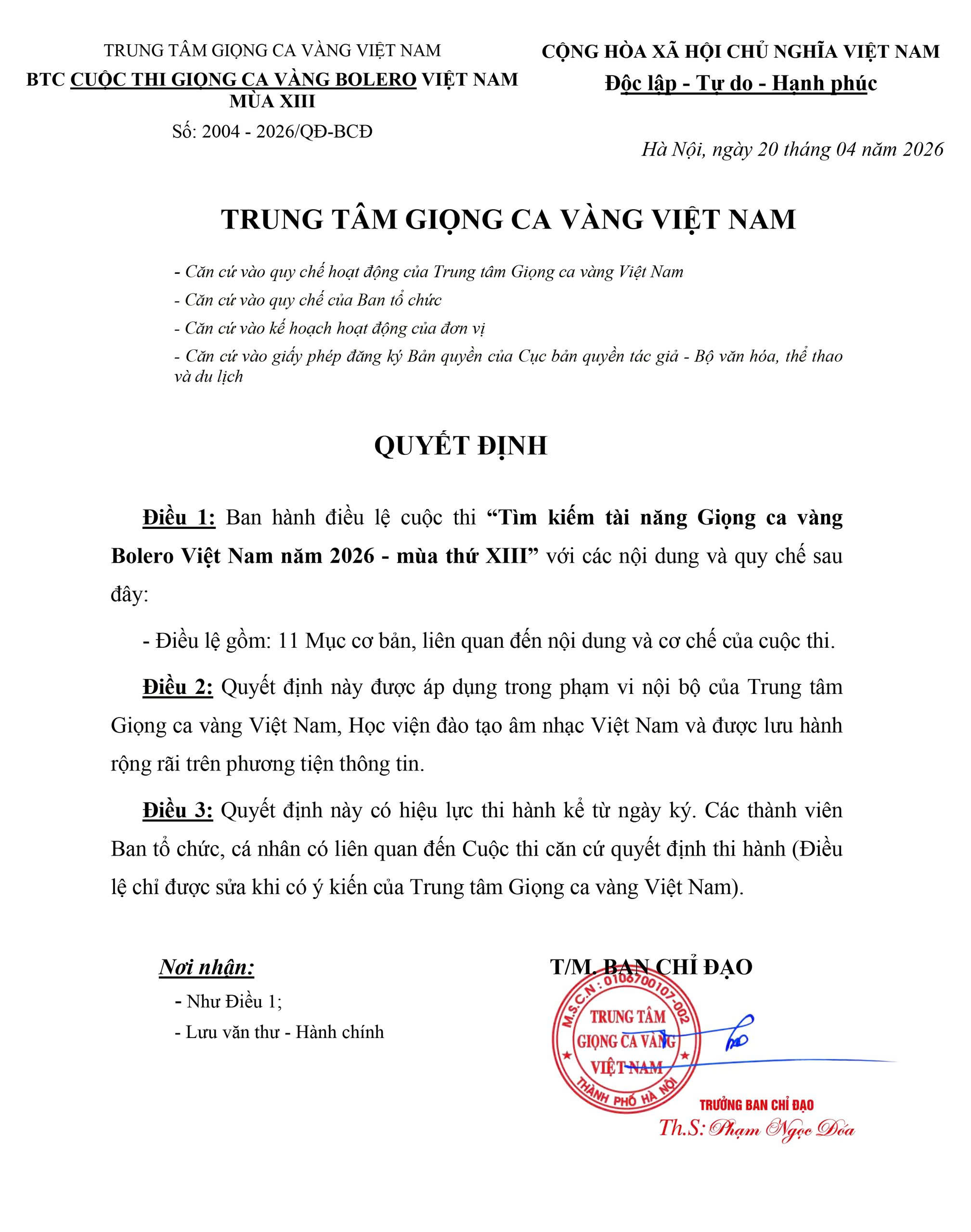Hôm nay, ngày 21/04/2026, Ban tổ chức cuộc thi Tìm kiếm tài năng Giọn