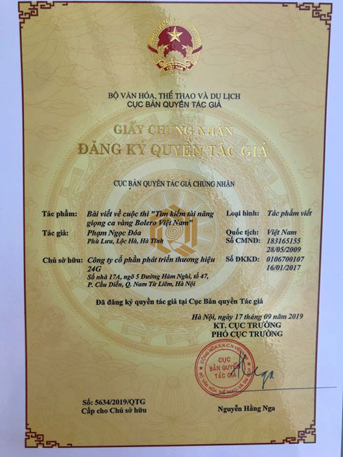 Bộ Văn hóa, Thể thao và Du lịch - Cục Bản quyền tác giả cấp chứng nhận đăng ký quyền tác giả cho chương trình “Tìm kiếm tài năng Giọng ca vàng Bolero Việt Nam”