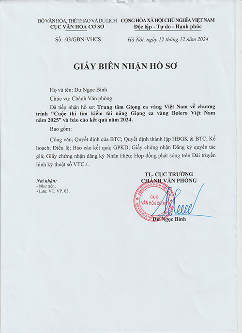 Biên nhận Hồ sơ dự thi Giọng ca vàng Bolero Việt Nam năm 2025