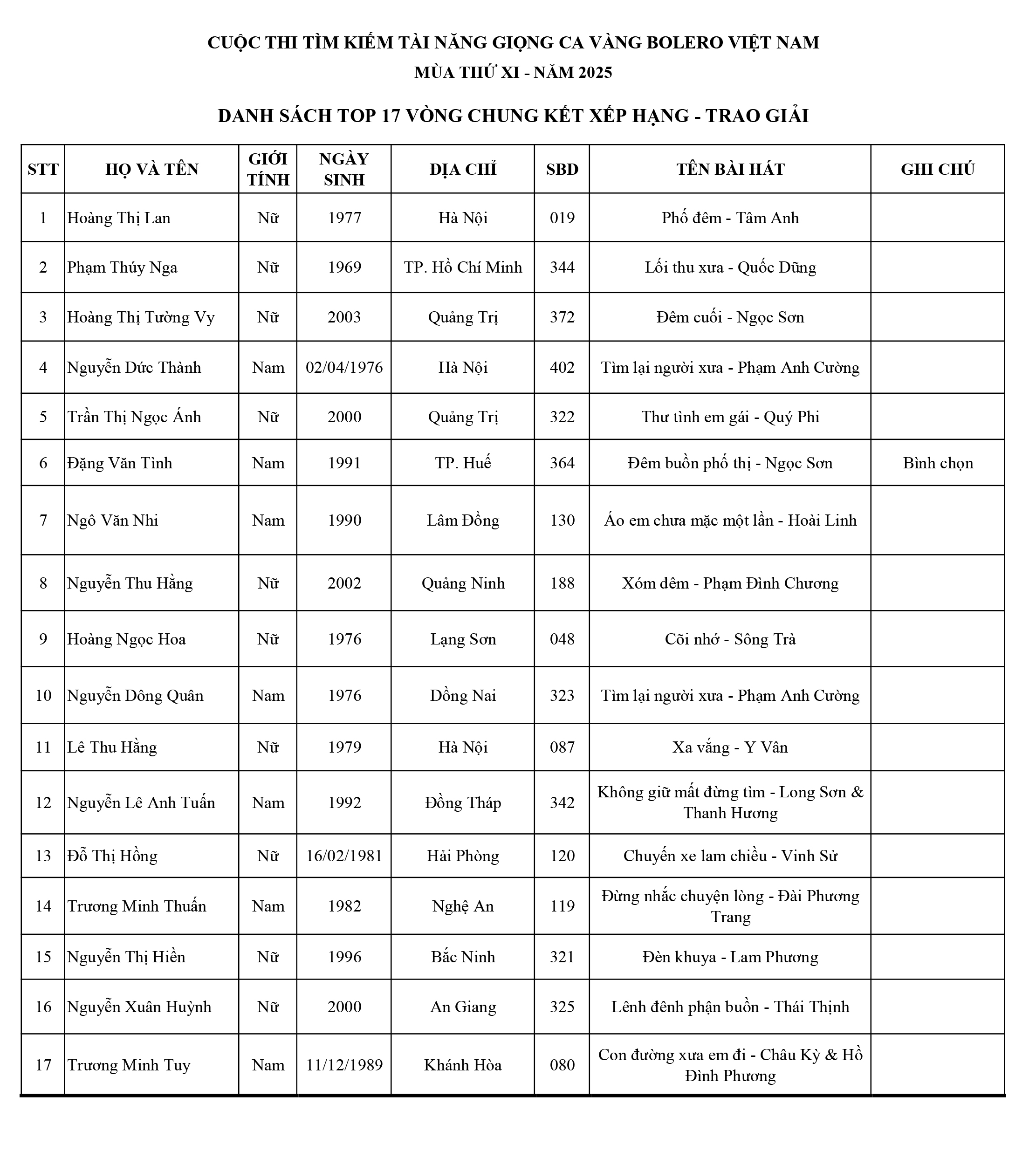 Danh sách 17 thí sinh lọt vào Chung kết xếp hạng